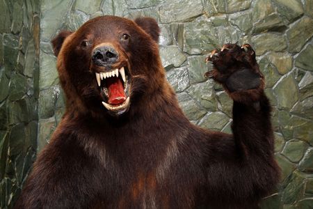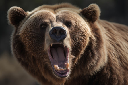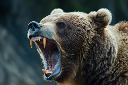 Roaring brown bear close-up. Powerful jaw and large sharp teeth of the bear. A bear's eyes reflect a sense of urgency or anxiety.