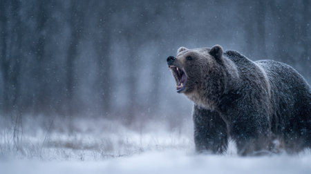Powerful and Majestic Grizzly Bear Roaring in a Snowy Forest Landscape during Winter Season with Falling Snowflakes and Dramatic Atmosphere