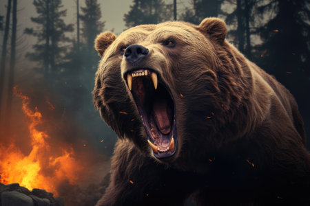 A large, angry bear with a brown fur coat is standing in front of a burning building. The bear is roaring and showing its teeth. The background is a bright orange flame.