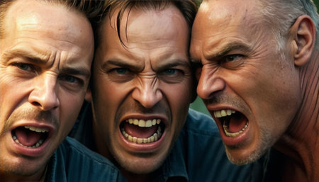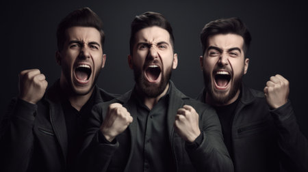 Portrait of three angry men screaming at the camera on a dark background, Generative AI