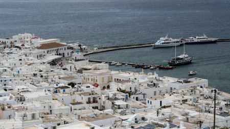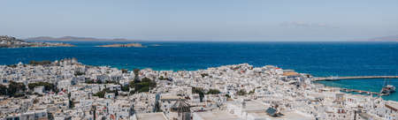 High angle panoramic view of Mykonos Town, Mykonos, Greece, on a sunny summer day.