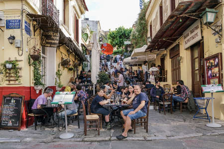 Athens, Greece - April 30, 2016: Cozy street cafes full of tourists at Athens downtown. People are eating and talking outside in Athens, Greece
