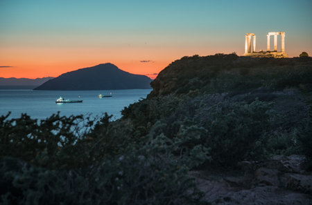 Panorama of Athens at sunset. Beautiful cityscape with seashore and distant islands visible under the red sunset sky. Travel photography.