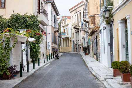 Athens Greece. November 22, 2020. Plaka traditional buildings and streets, old town architecture, coronavirus lockdown day. Man wearing a COVID 19 face protective mask walking alone.