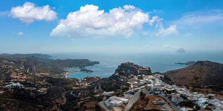Kythira island, Greece. Aerial drone view of Kythera Chora and castle and Kapsali twin bay coast, Calm Aegean sea and cloudy blue sky