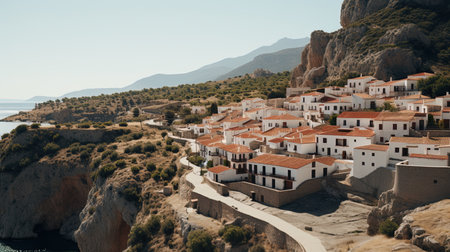 Tranquil Greek fishing village with whitewashed houses fishing boats