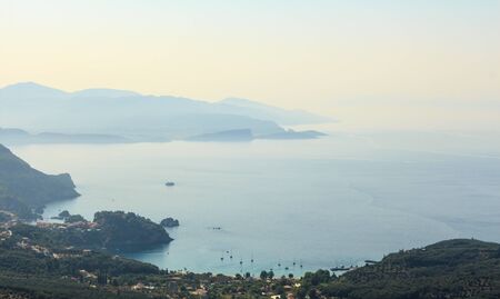 Seascape morning bay with distant mountains, islands and tranquil sea