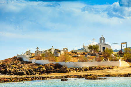 Typical greek church in white color and red roof and cemetery in the fron in warm hot day.