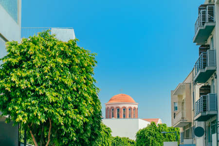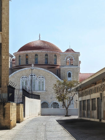 View of an Orthodox church in the city of Limassol in the afternoon from teh distant street.