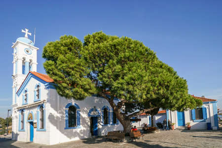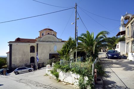 Kontopouli, Greece - September 20th 2015: Unidentified people, church and cars in the rural village on Lemnos island