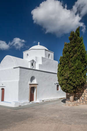 Folegandros, Greece - September 23, 2020: Traditional Greek whitewashed church in charming Chora, the capital of the island of Folegandros.
