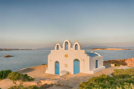 Local church in Pirgaki in Paros island against the blue Aegean sea. A beautiful landscape.