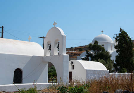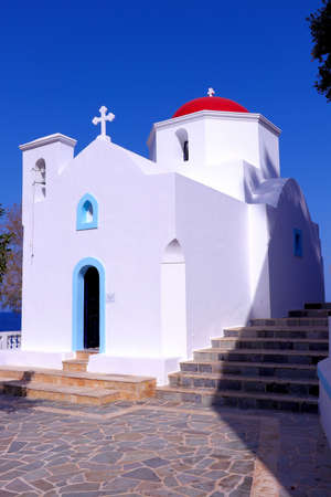 View of the Agia Irini, Saint Irene, Greek Orthodox church, traditional white building with belfry. Beautiful summer sunny day. Chora, Ios Island, Greece.