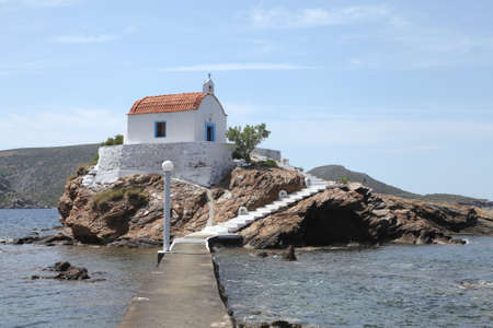 Beautiful church on the island bay in Greece