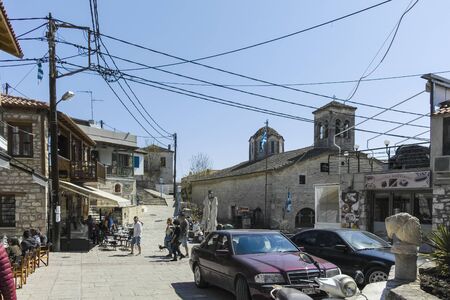 AFYTOS, KASSANDRA, GREECE - MARCH 31, 2019: Old Houses and streets in the historical town of Afytos, Kassandra, Chalkidiki, Central Macedonia, Greece