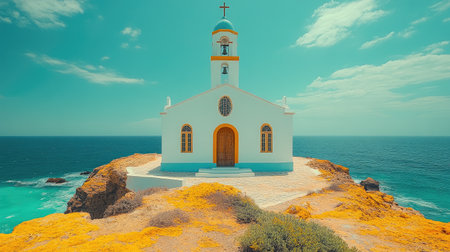 A church stands proudly on a cliff, offering a panoramic view of the vast ocean below.