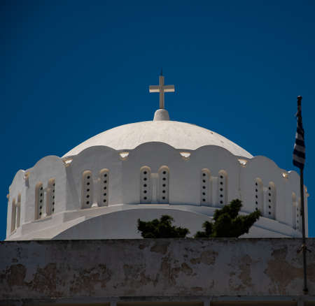 Santorini, Greece - White church on blue sky background