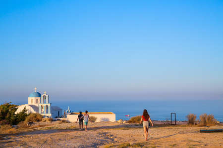 Back view of family of father and kids on summer vacation walking near blue domed church on Santorini island Greece