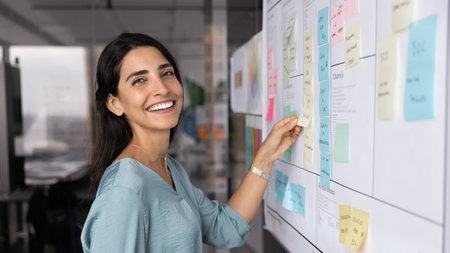 Portrait of happy Brazilian businesswoman stands near board, placing sticky notes with creative solutions, thoughts and strategy, engaged in planning or brainstorm ideas for startup. Task management