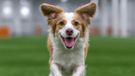 A joyful border collie runs effortlessly across the green grass in an indoor training facility, showcasing its agility and friendly spirit, perfect for pet lovers.