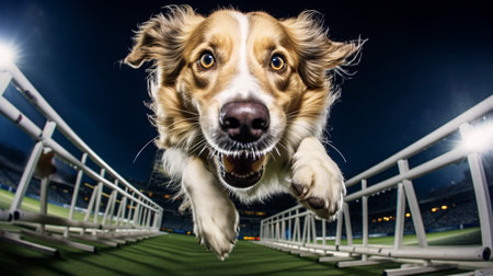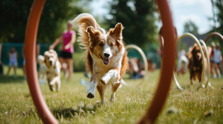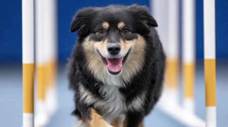 A joyful dog confidently navigates an agility course, showcasing its training and enthusiasm in a vibrant indoor environment. The image captures the spirit of companionship and the thrill of canine sports.