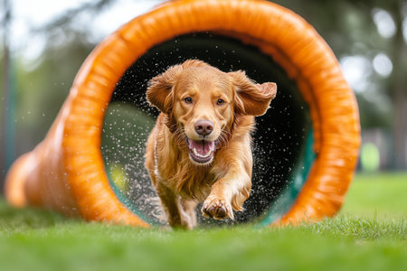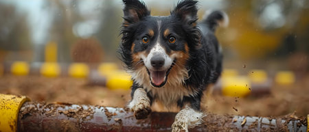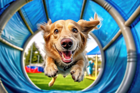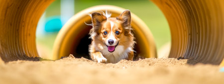 agility sport for dogs, a dog runs in a tunnel at a competition, banner, made with Generative AI