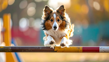 With intense focus and graceful athleticism, a beautiful Shetland Sheepdog soars over a jump during an agility competition. The warm, backlit glow of the sun highlights its flowing fur, capturing a perfect moment of speed, skill, and determination in canine sports.