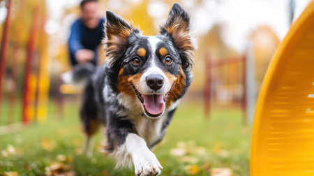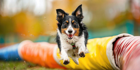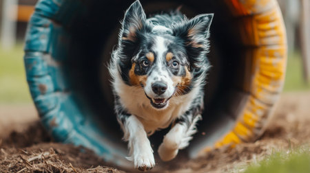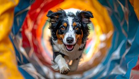 With intense focus and pure joy, a talented Australian Shepherd bursts from the end of a colorful agility tunnel. This dynamic shot captures the peak of canine athleticism, speed, and the strong bond between a dog and its handler during training.