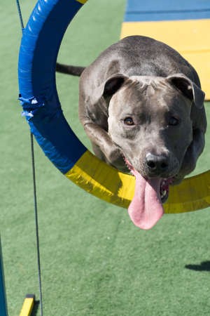 Pit bull dog playing in the park. Jumping in the circle like taking off and going up the ramp to exercises.
