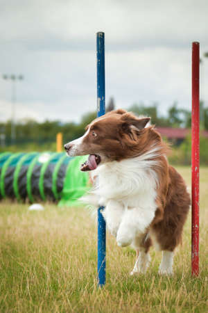 Australian shepherd dog in agility slalom on competition. Amazing day on czech agility competition in town Ratenice it was competition only for large.