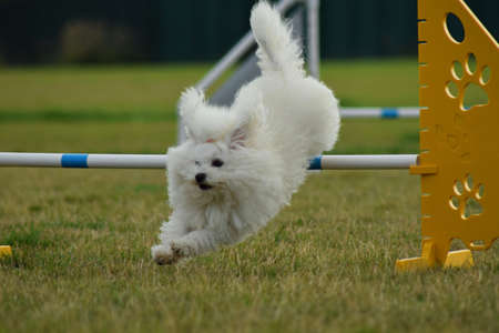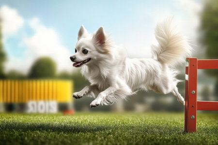 Happy Small Dog Leaping Over Agility Hurdle in Outdoor Training Course.