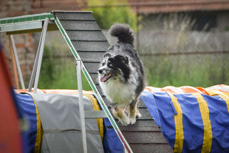 Australian shepherd in agility balance beam. Amazing day on Czech agility competition. They are middle experts it means A2.