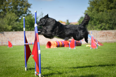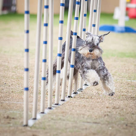 Cute little dog doing agility drill - running slalom, being obediend and making his master proud and happy