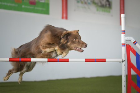 Australian Shepherd. Dog on agility competition. The Aussie dog jumps over an obstacle. Sporting event, achievement in sport. Summer light. Summer