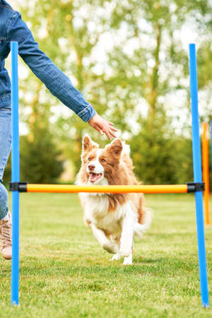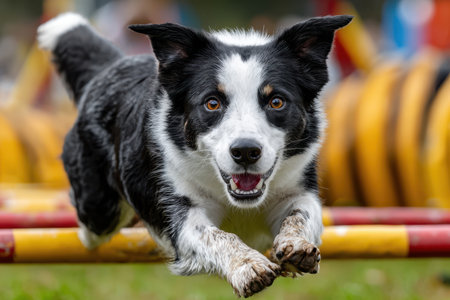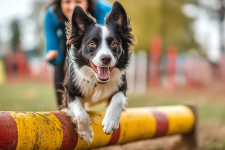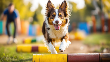 A joyful border collie leaps over an agility hurdle under the encouragement of its owner. Bright colors of the training area enhance the energetic atmosphere of the activities on a sunny day.