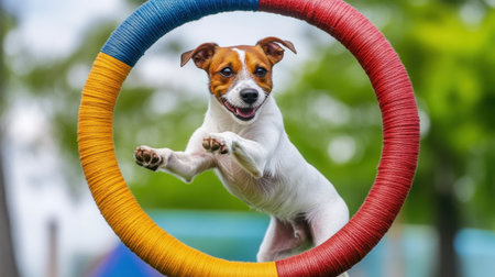 Jack Russell Terrier in mid-air leaping through a colorful hoop, showcasing agility and skill at a pet competition