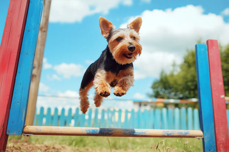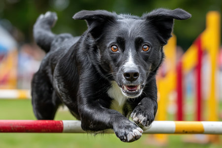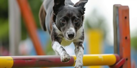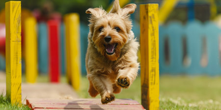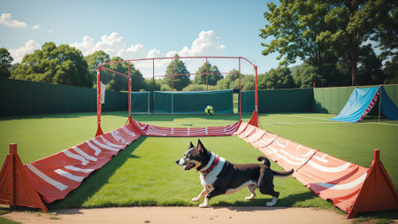 A joyful dog demonstrates its agility skills while navigating through an obstacle course, showcasing the fun of pet training in an engaging environment.