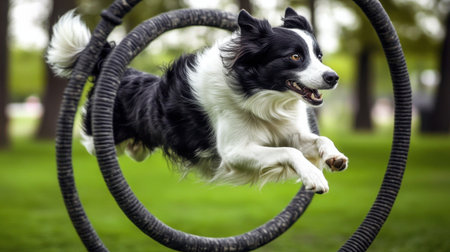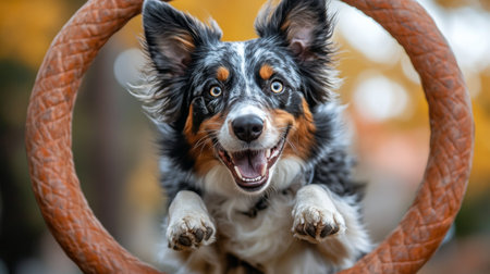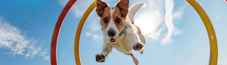 dog jumping through hoop, action shot, clear sky background, sharp, bright colors , hyper realistic