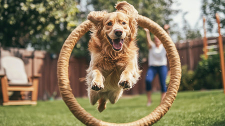 A delightful moment of a dog jumping through a hoop in a backyard, with its owner cheering in the background, capturing the excitement of playtime