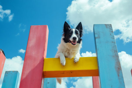 Border Collie dog looking down from a colorful wooden obstacle during agility training, with a blue sky and white clouds in the background