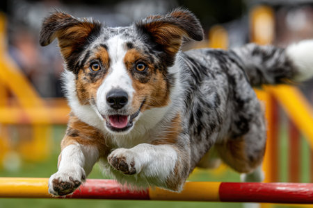 With intense focus and boundless energy, a talented Australian Cattle Dog soars over a jump during an agility trial. This image captures the peak of canine athleticism, precision, and the joyful spirit of a working breed excelling in its element.