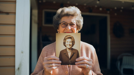 A senior white woman holds up a vintage photo of herself when she was younger, reminiscing about cherished memories and the passage of time. AI Generative AI