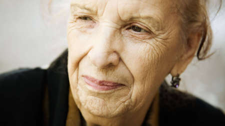 Elderly woman looking at an old photo in her hands.
