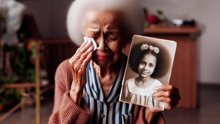 Elderly woman gazes at vintage photos, reflecting on memories and the challenges of dementia
