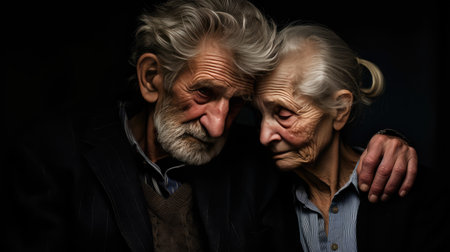 Very old grandma and grandpa cuddling on couch. Love in old age. Wife puts her head on husbands shoulder. Elderly people.
