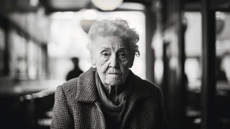 elderly woman in black and white photo, standing by store window. serene face, fleeting light contrasts, strong facial expression. grainy texture adds depth. focus stacking technique used. emotionally intense, expressionist style captured. ai generated