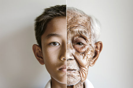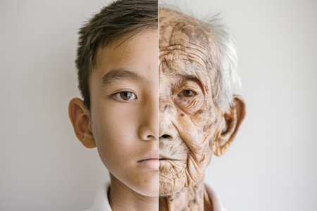 Split portrait of young and elderly Asian male faces, highlighting aging concept, AI Generated
