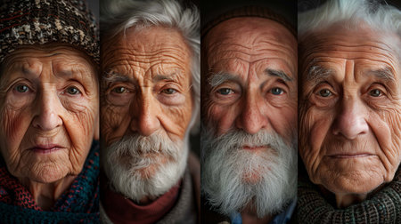 This image showcases a collection of portraits featuring elderly individuals with diverse ethnicities, each displaying unique facial features and expressions. The composition is characterized by a close-up perspective, emphasizing the details of skin texture, hair, and gaze. The overall mood is solemn, and the lighting highlights the contrast between the dark background and the faces. Suitable for editorial and commercial use.