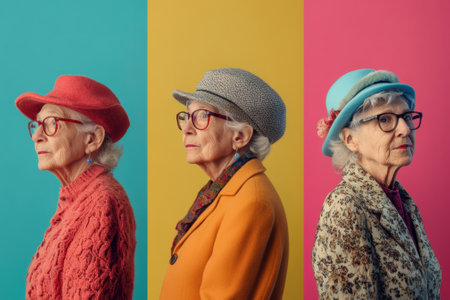 Three elderly individuals wearing bright and colorful jackets pose against a teal-colored background. The peculiar styles and confident postures convey a sense of uniqueness, creativity, and individuality.