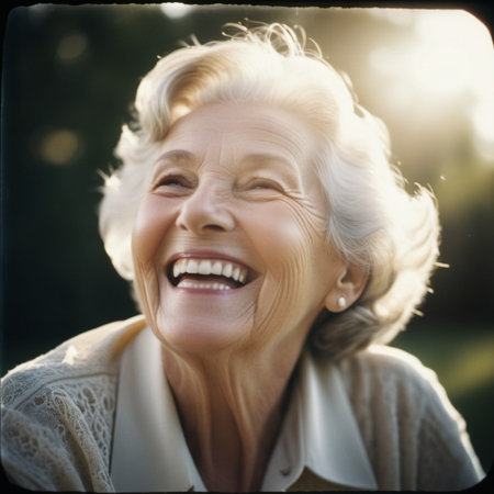 Elderly Caucasian woman with white hair, smiling widely. She is looking upwards. An old lady with a Scandinavian face type. Gray hair, white teeth. Cheerful active cheerful pensioner. Generated AI.